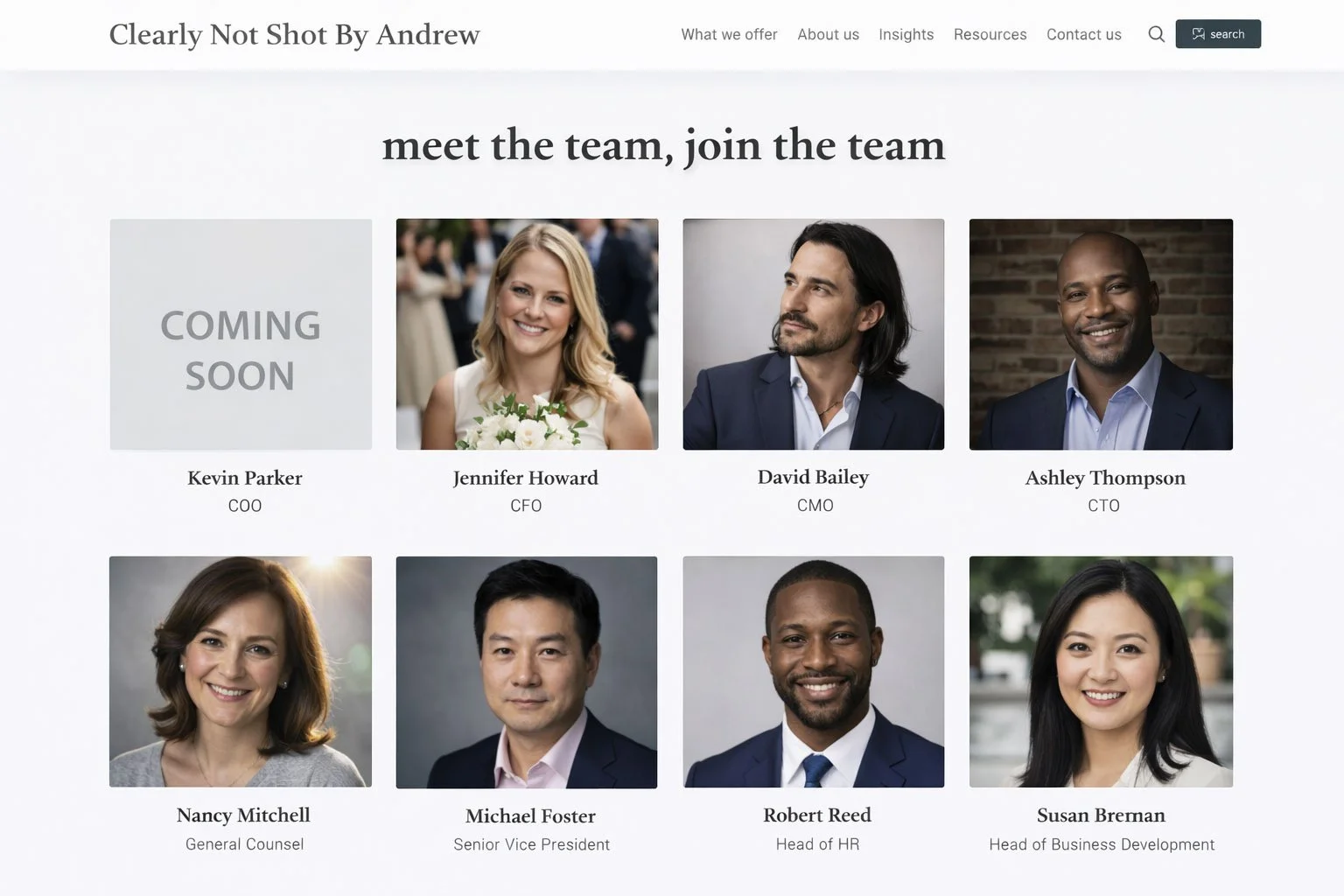It's the "Meet the Team" page where Susan’s photo looks like it was taken at a garden party in 2017, Dave's is a slightly blurry LinkedIn crop, and the CEO has a beautifully lit studio portrait that belongs in a different universe entirely.